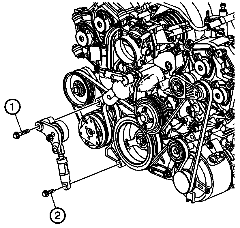 19. Install the accessory belt tensioner lower bolt (2) and tighten to 25 Nm (18 lb ft).