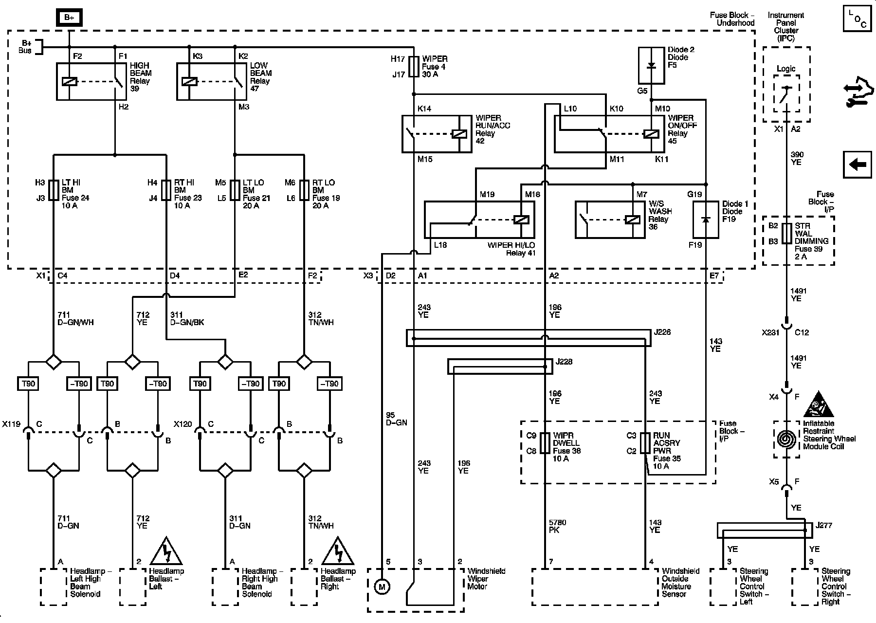 LT HI BM, RT HI BM, LT LO BM, RT LO BM, WIPER, WIPR DWELL, RUN ACSRY PWR, STR WAL DIMMING Fuses, and HIGH BEAM, LOW BEAM, WIPER RUN/ACC, WIPER ON/OFF, AND WIPER HI/LO Relays