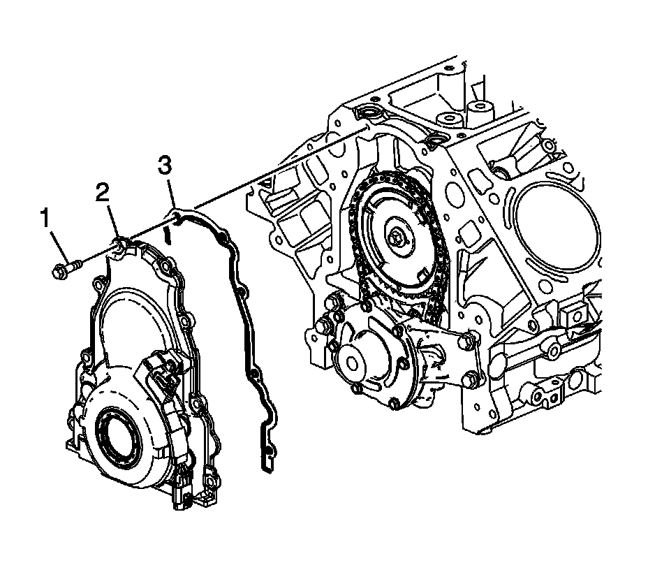 2. Install the front cover gasket (3), front cover (2), and bolts (1).