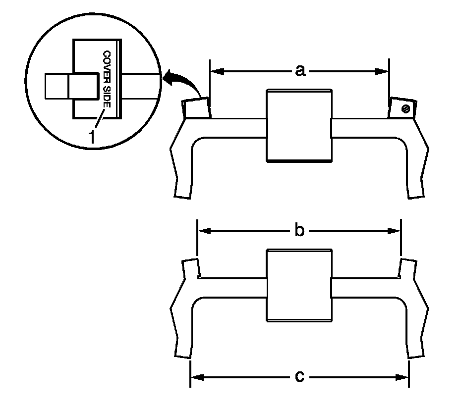 5. Install the EN-48853-2 adapters as required for usage on the 141 mm (5.55 in) dimension (a) front cover. Position the adapters against the legs of the EN-48853 - tool with the words "cover side" (1) facing away from the tool.