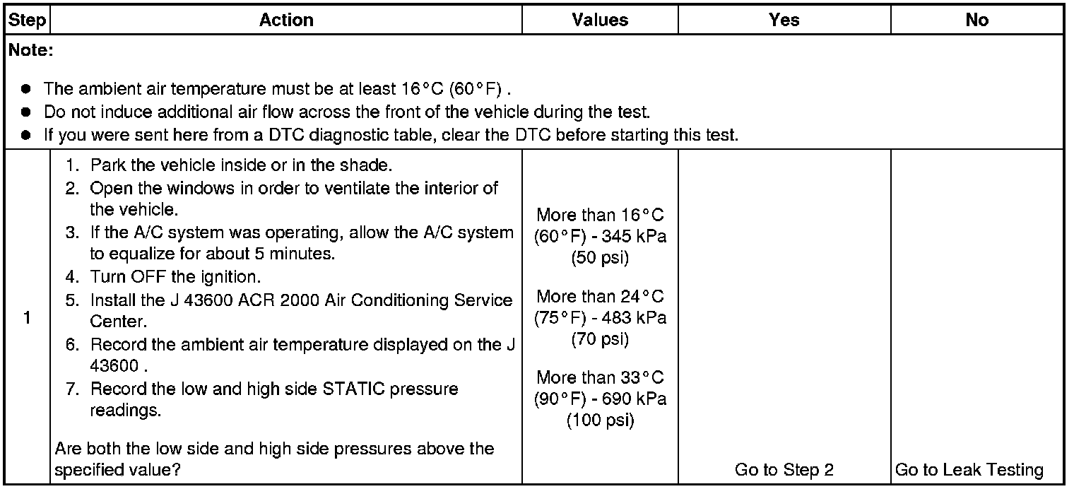 1. This step determines if the A/C system has at least the minimum refrigerant charge required to operate the system without damage.