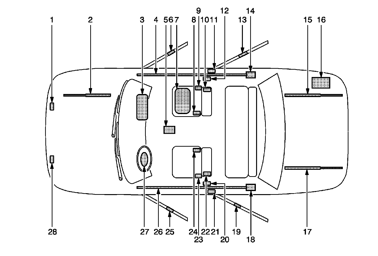 26 - Left Roof Rail Air Bag-Located under the headliner, extending from the driver front windshield pillar to the driver rear windshield pillar