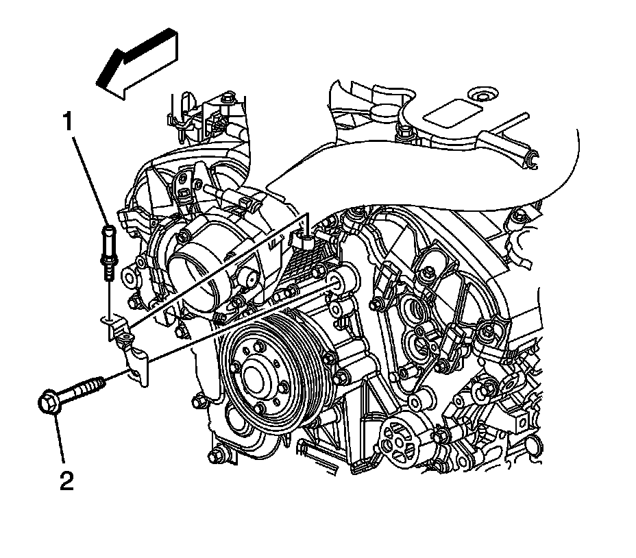 11. Remove the upper intake manifold brace stud (1) and bolt (2), reposition the brace with the wiring harness.