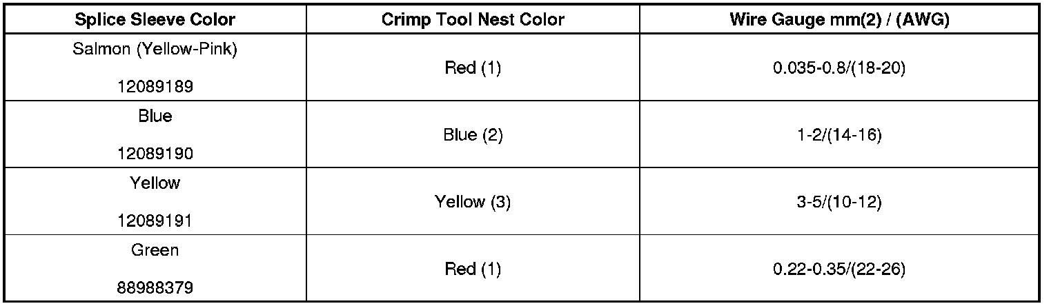 6. Select the proper DuraSeal splice sleeve according to the wire size. Refer to the above table at the beginning of the repair procedure for the color coding of the DuraSeal splice sleeves and the crimp tool nests.