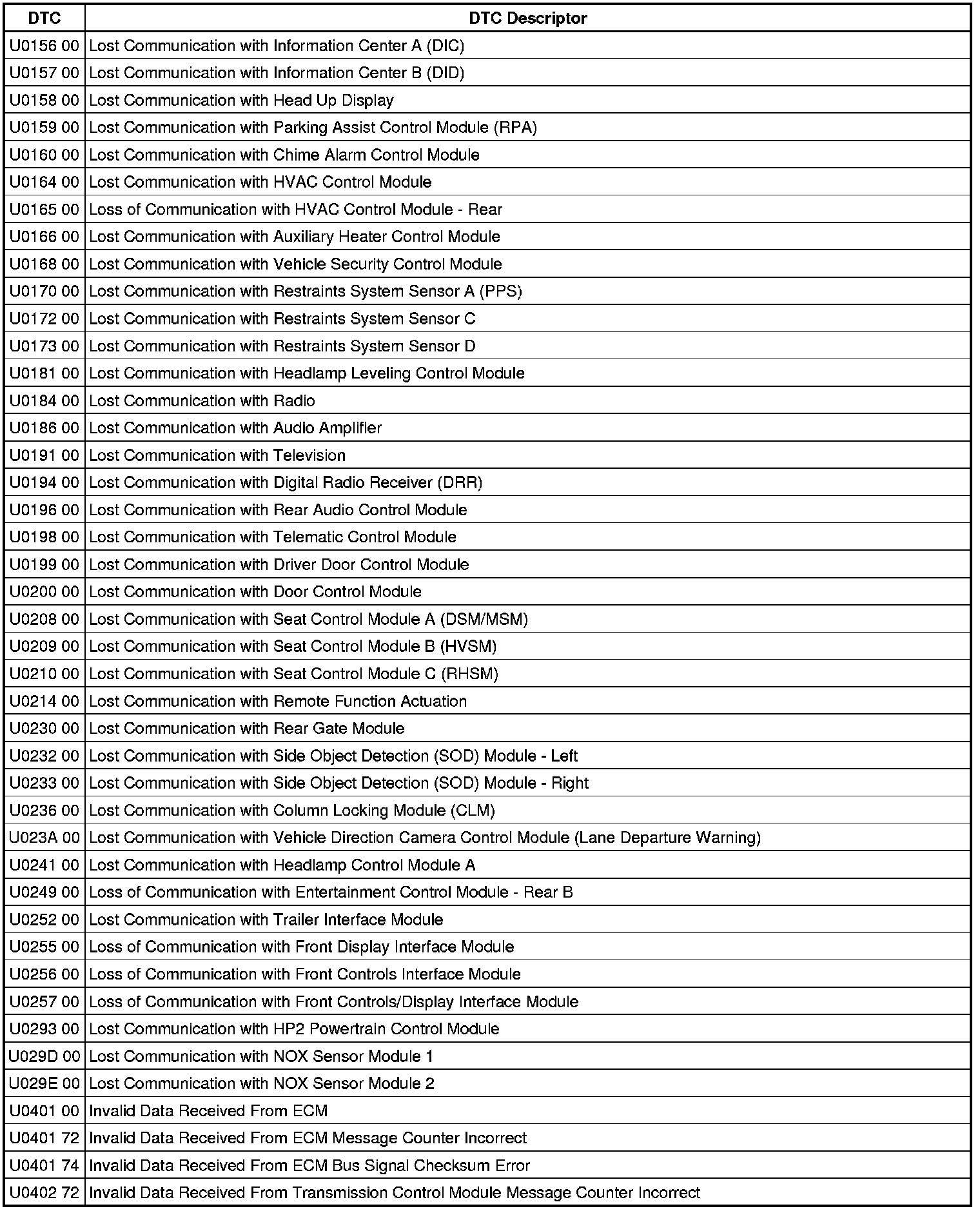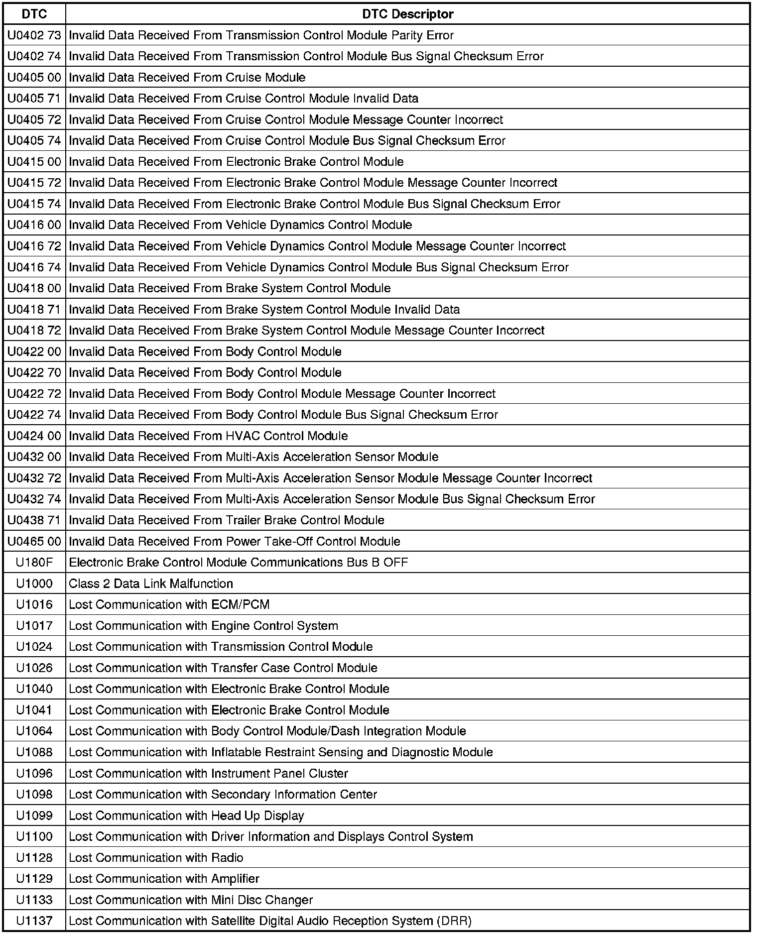 This list includes all Data Communications related U-code DTCs in alphanumeric order with descriptors for all modules. Not all DTCs listed will be applicable to all vehicles.