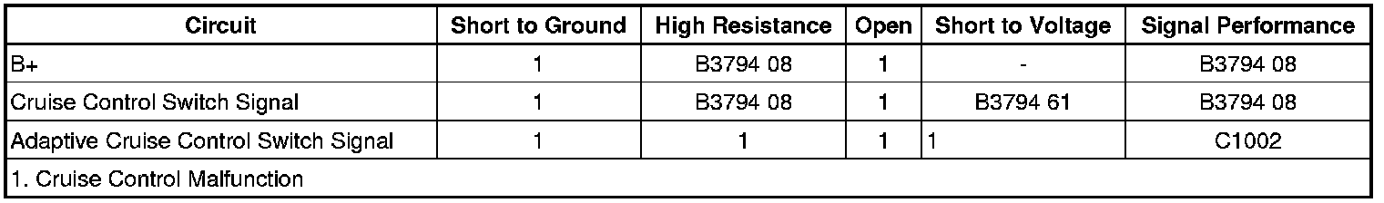 The adaptive cruise control switch is an input to the body control module (BCM). The BCM monitors the adaptive cruise control switch signal circuit in order to detect when the driver has requested to perform a tap up or tap down function. The BCM detects a specific voltage signal on the cruise control switch signal circuit when a switch is applied.