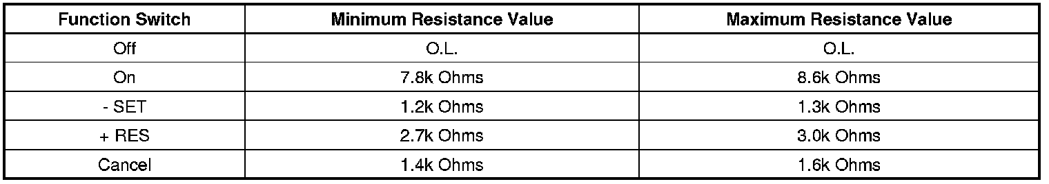 2. Cruise control switch ON, measure the resistance between terminal 1 and terminal 3 while individually activating and holding each cruise control function switch and compare the resistance reading to the values in the table below.