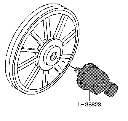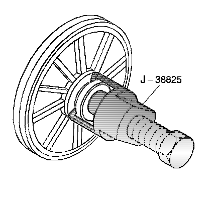 2. Install the water pump pulley onto the intake camshaft using the J 38823. During installation, the tool will bottom out on the camshaft at the proper depth.