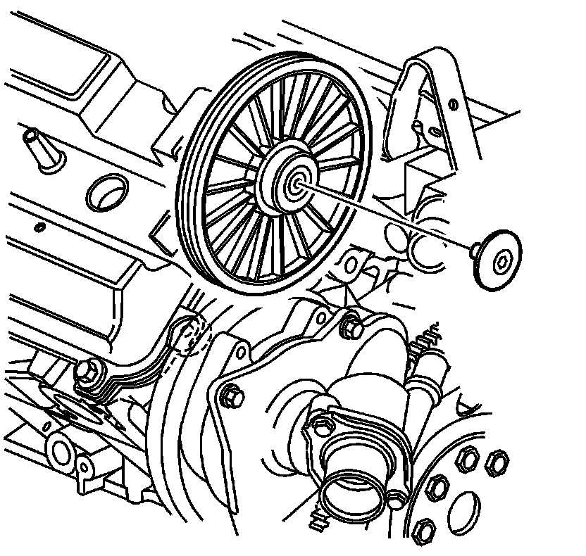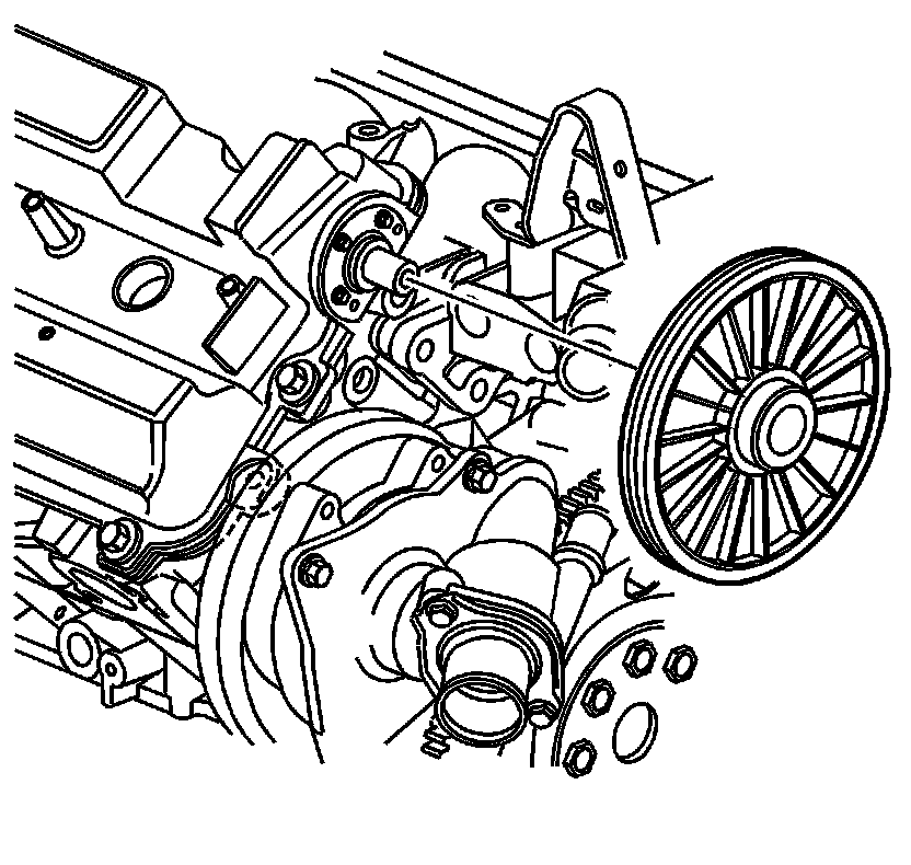1. Release the outer water pump drive belt tensioner and remove the drive belt from the drive pulley. Refer to Water Pump Belt Replacement (Water Pump Belt Replacement).