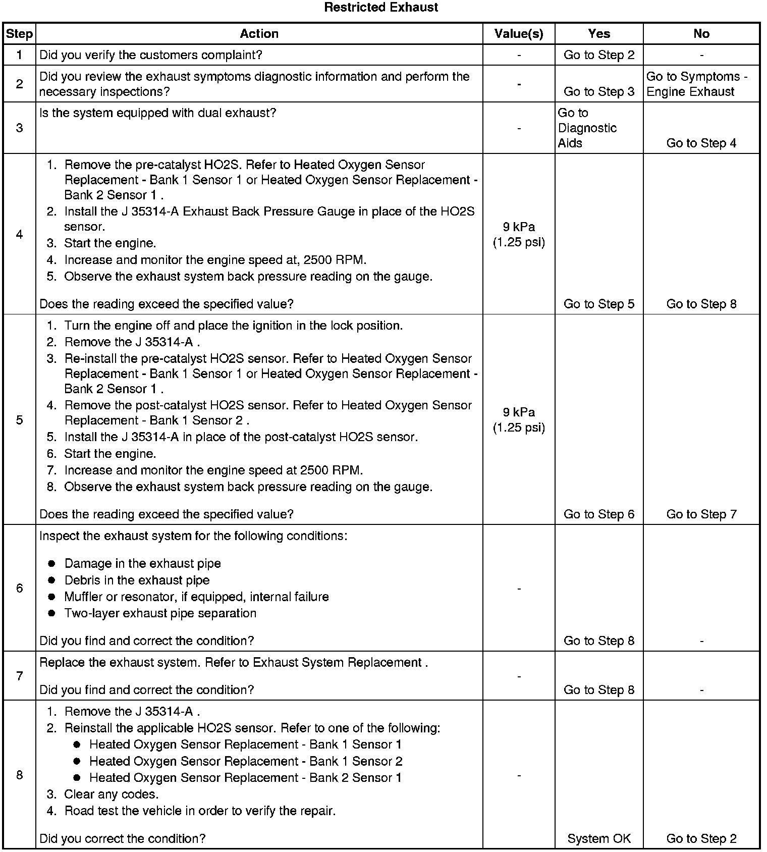 For dual exhaust systems a quick check of exhaust flow will help determine which side of the exhaust system is restricted. The side that has less exhaust flow is the side that will be suspect, and diagnosis should begin there.
