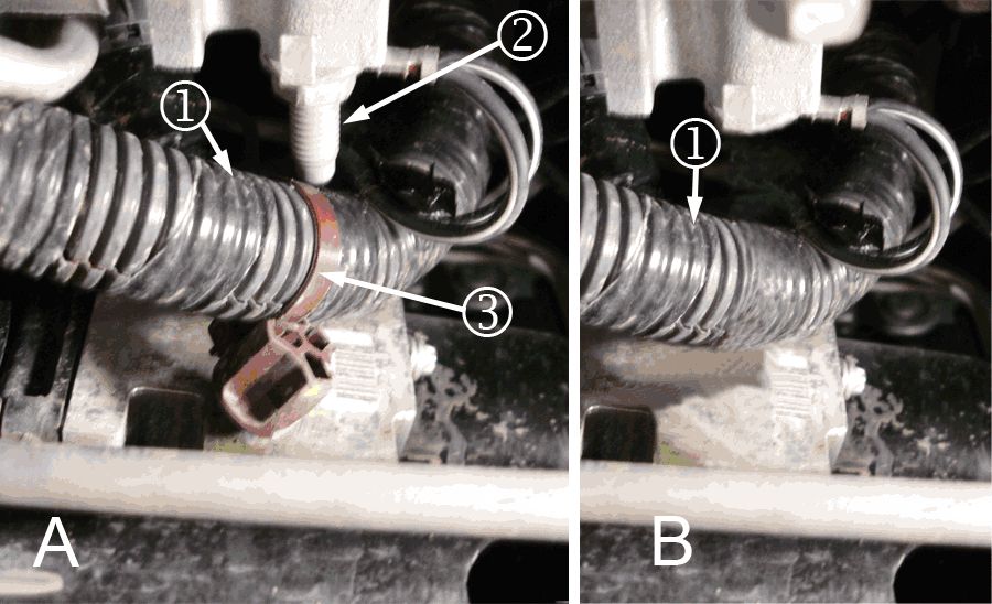 - If the EBCM harness does NOT have a clip (3) and ground stud (2) as shown in the "B" portion of the illustration, proceed to Step 5.