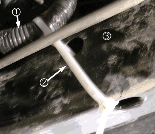5. Secure the EBCM harness (1) to the frame (3) using a tie strap (2) and two holes in the frame. Refer to the illustration.