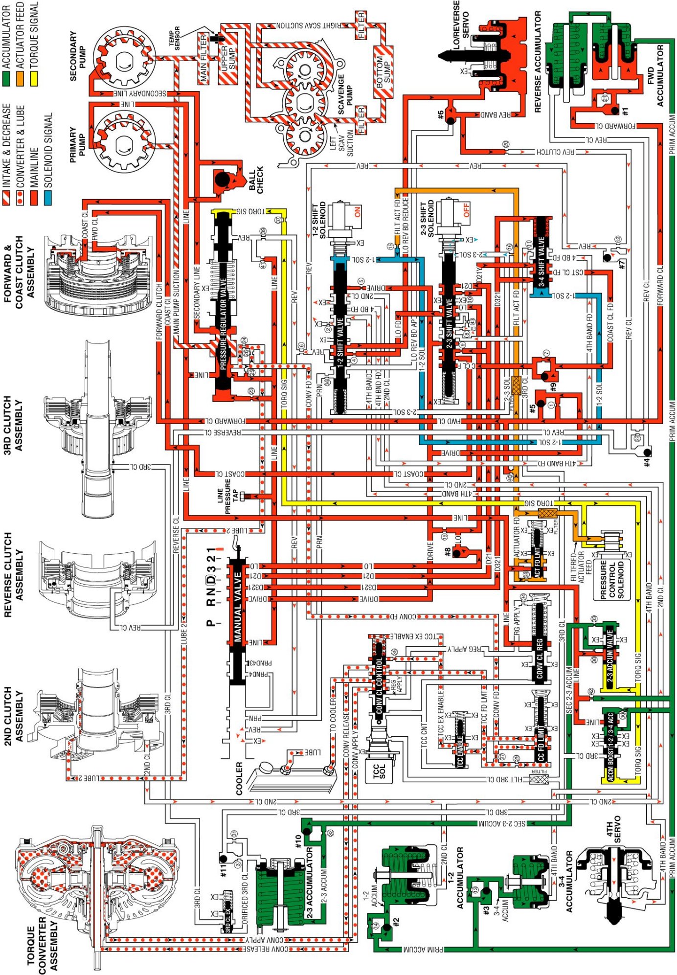 Low fluid pressure unseats the #8 checkball, which is located in the valve body. This pressure then routes Low fluid to the 2-3 shift valve.