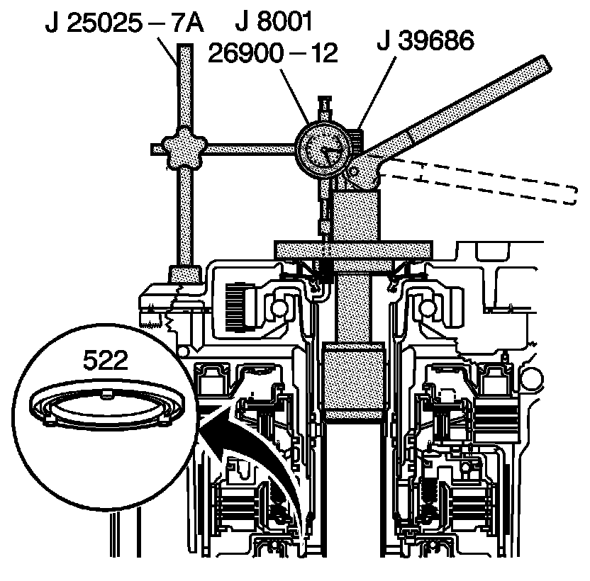 If the measurement is out of the specification range, determine the appropriate selective thrust washer (522) for installation upon reassemble.