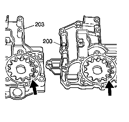 3. Inspect the pump gears (201, 202, 205, 206). These gears must be installed with the dimples facing up.