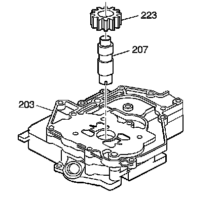 6. Install the oil pump driven shaft (207) into the pump assembly. The end of the shaft with the four notches is located in the secondary pump.