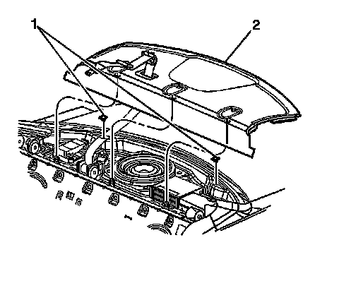 1. Route the rear seat shelf panel (2) to the rear cross car beam at the dual lock fasteners (1).