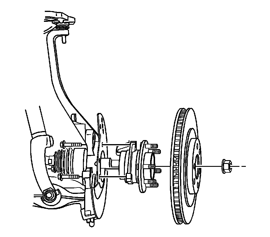 6. Install the brake rotor. Refer to Front Brake Rotor Replacement (JE5, JL9) (Front Brake Rotor Replacement (JE5, JL9))Front Brake Rotor Replacement (J56) (Front Brake Rotor Replacement (J56)).