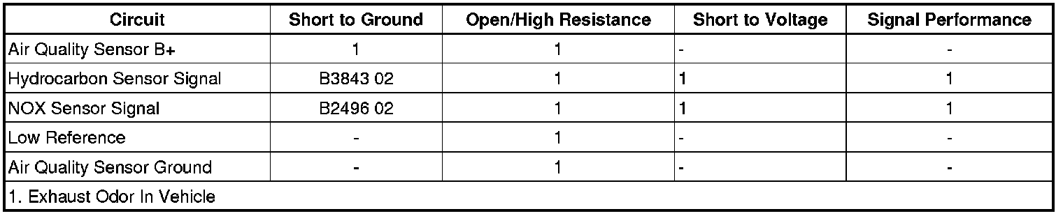The HVAC control module monitors the outside air quality via the air quality sensor assembly while in AUTO mode. The air quality sensor is a 5-wire sensor with a single ignition voltage circuit, a ground circuit, a low reference circuit, and two signal circuits. There are 2 sensors inside the air quality sensor assembly. A hydrocarbon (HC) sensor which is used for detecting gasoline exhaust fumes and a NOX sensor which is used for detecting oxides of nitrogen. When high levels of HC are detected at the front of the vehicle the HC sensor resistance and signal voltage are low. When high levels of NOX are detected at the front of the vehicle the Nox sensor resistance and signal voltage are high.