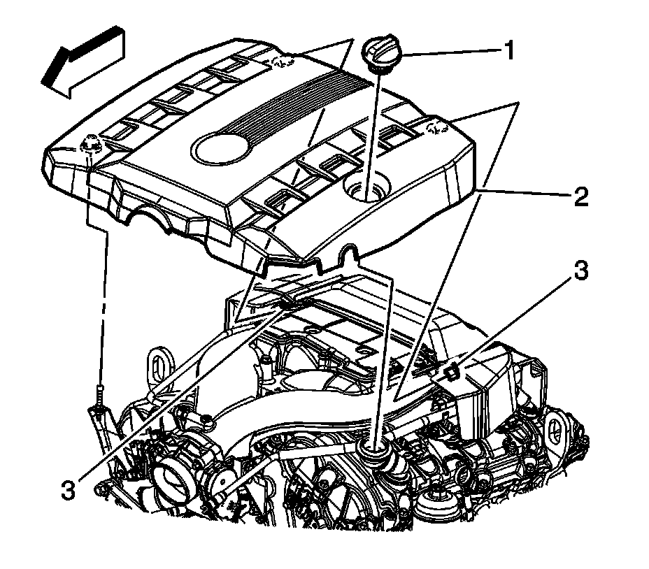 3. Disengage the cover/shield (2) from the ball studs by pulling up firmly on the right and left front of the engine cover.