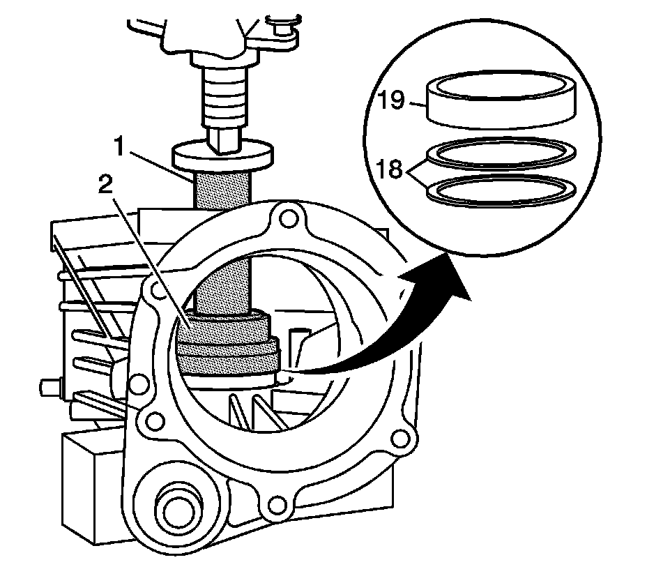 3. Using the J 24433 (2) and the J 45010 (1) install the shim (18) and the bearing cup (19) into the differential housing.