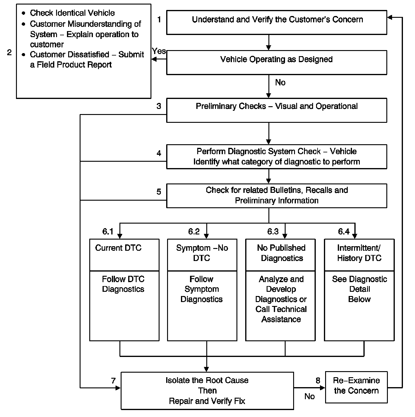 8. Re-examine the Concern: If a technician cannot successfully find or isolate the concern, a re-evaluation is necessary. Re-verify the concern. The concern could be an intermittent or normal condition.