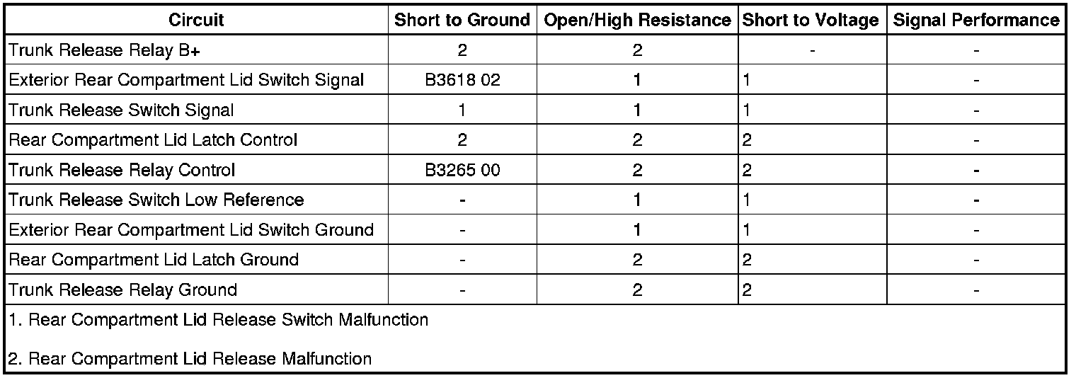 The interior rear compartment lid release switch receives a signal from the driver door lock/window switch. When the interior rear compartment lid release switch is activated, the signal circuit is pulled to ground. The driver door lock/window switch interprets this and sends a serial data message to the body control module (BCM) requesting the rear compartment lid be released. The BCM responds by applying battery voltage to the trunk release relay control circuit which energizes the TRUNK/RELSE relay. The trunk release relay is supplied with battery voltage at all times. With the relay coil energized, the relay switch contacts close allowing battery voltage to flow to the rear compartment lid release actuator causing the rear compartment lid to release.