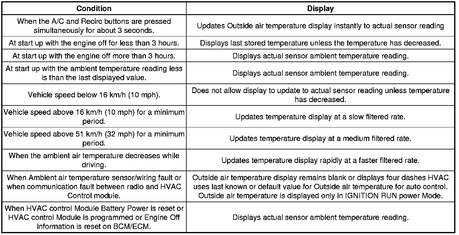 The inside temperature sensor operates within a temperature range between -6.5°C and 57.5°C (20.3°C-135.5°F). If the sensor is shorted to ground, voltage, or an open, the system will operate using an estimated default value to allow the system to operate. The ambient sensor operates within a temperature range between -30°C to 51°C (-22 to 123.8°F). If the HVAC control module has determined that the ambient temperature sensor has failed, the radio display will not display the ambient temperature reading. The radio displays the ambient air temperature value that it receives from the HVAC control module through a GMLAN message. The ambient air temperature sensor mounts underhood and can be affected by city traffic, by idling, and by restarting a hot engine. Therefore, the HVAC control module filters the value of the ambient air temperature sensor for temperature display. The outside air temperature reading is always instantly updated if ambient air temperature has decreased. The ambient air temperature value is updated under the following conditions: