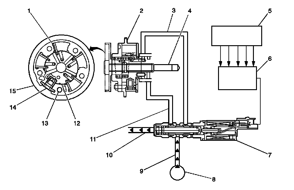 The CMP actuator solenoid valve (7) is controlled by the ECM. The crankshaft position (CKP) sensor and the CMP sensors are used to monitor changes in camshaft positions. The ECM uses the following information in order to calculate the desired camshaft positions: