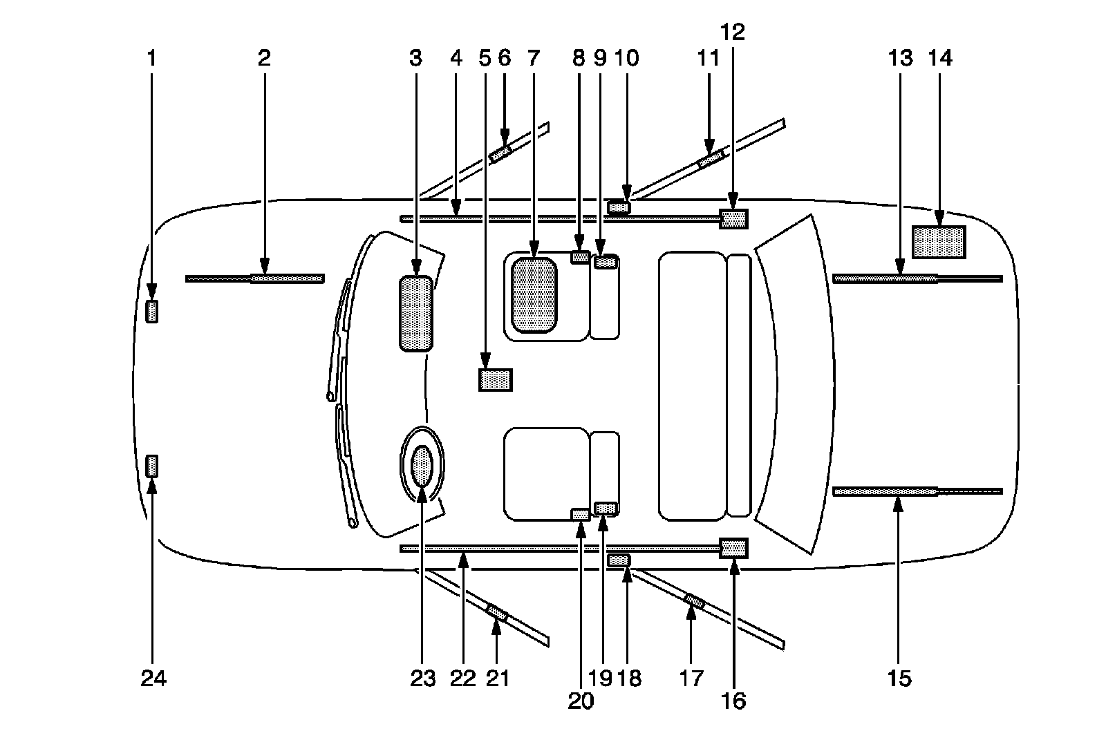22 - Left Roof Rail Air Bag-Located under the headliner, extending from the driver front windshield pillar to the driver rear windshield pillar