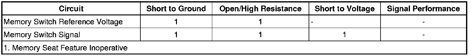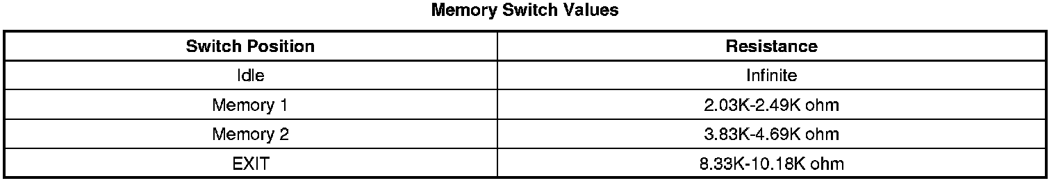 Reference voltage is supplied to the memory switch from the driver door module (DDM). When a memory switch is pressed, battery voltage is applied through the switch contacts, a series of resistors and thorough the memory switch signal circuit to the DDM. The door module then sends a serial data message to the memory seat module (MSM) indicating the memory recall request. The MSM then commands the appropriate seat motors to move to the pre-recorded seat positions stored in memory in response to the switch input.