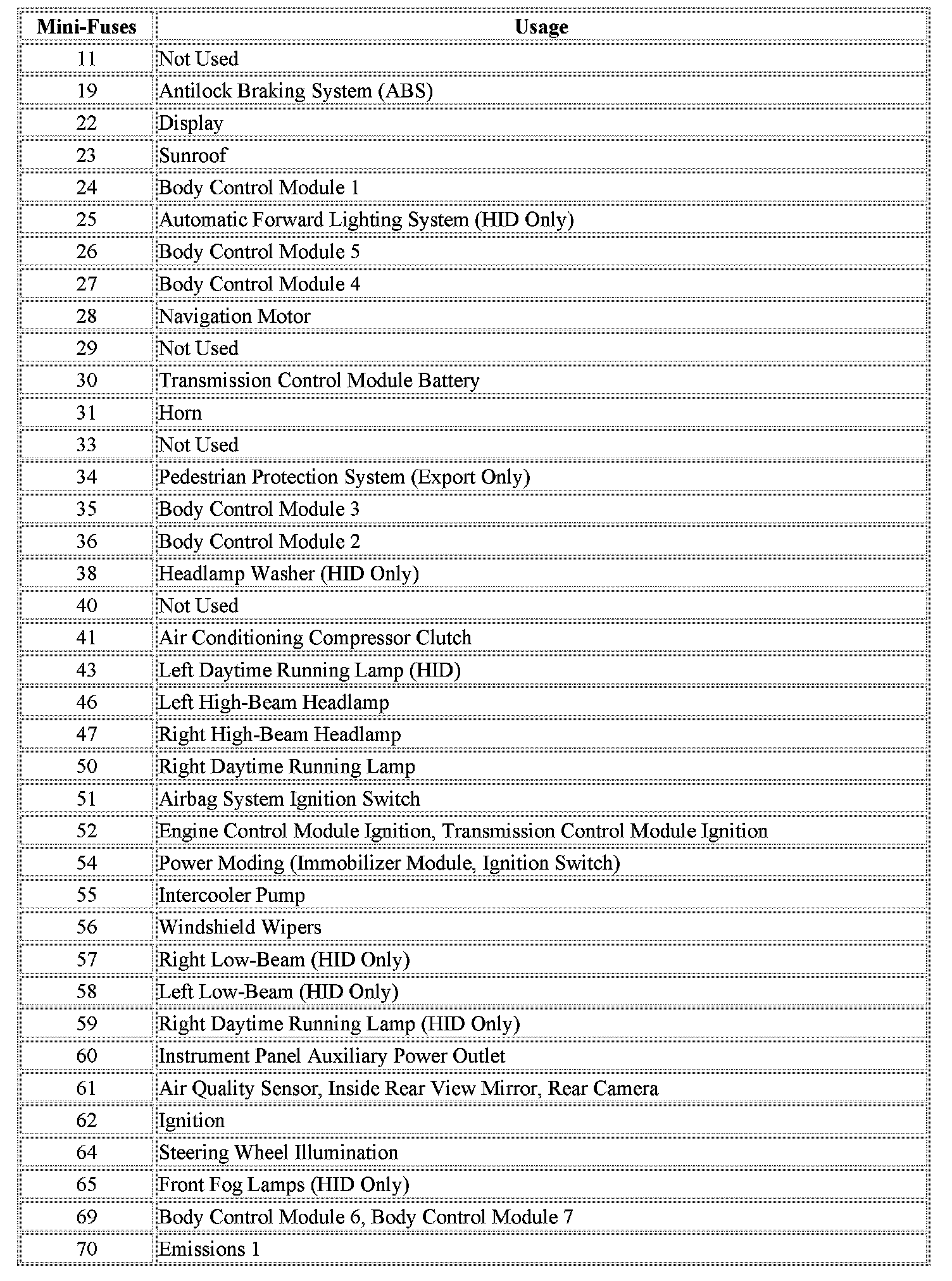 The vehicle may not be equipped with all of the fuses and relays shown.