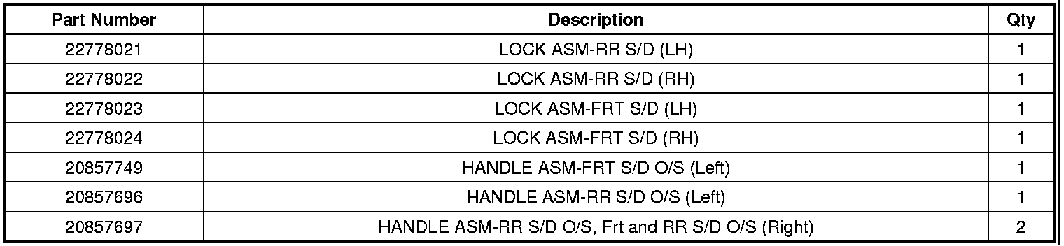 Replace all four door lock assemblies on the vehicle with the revised parts listed below. Refer to Front Side Door Lock Replacement and Rear Side Door Lock Replacement in SI.