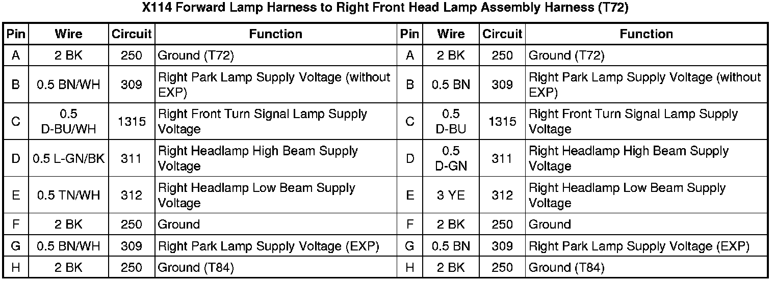 X114 Forward Lamp Harness to Right Front Head Lamp Assembly Harness (T72)