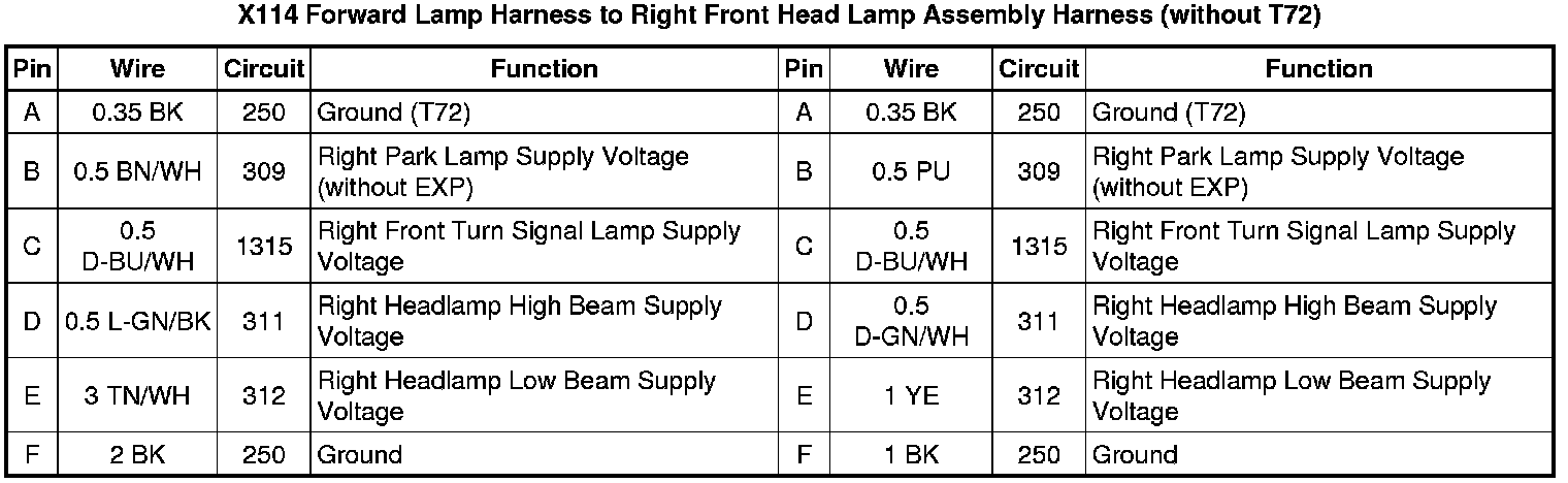 X114 Forward Lamp Harness to Right Front Head Lamp Assembly Harness (without T72)