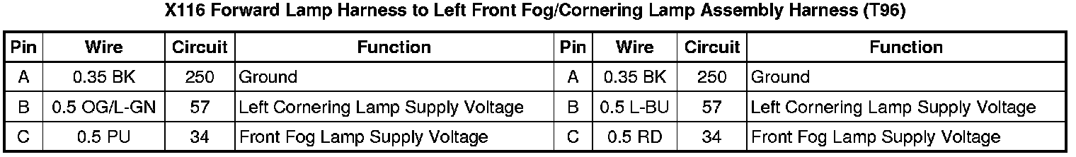 X116 Forward Lamp Harness to Left Front Fog/Cornering Lamp Assembly Harness (T96)