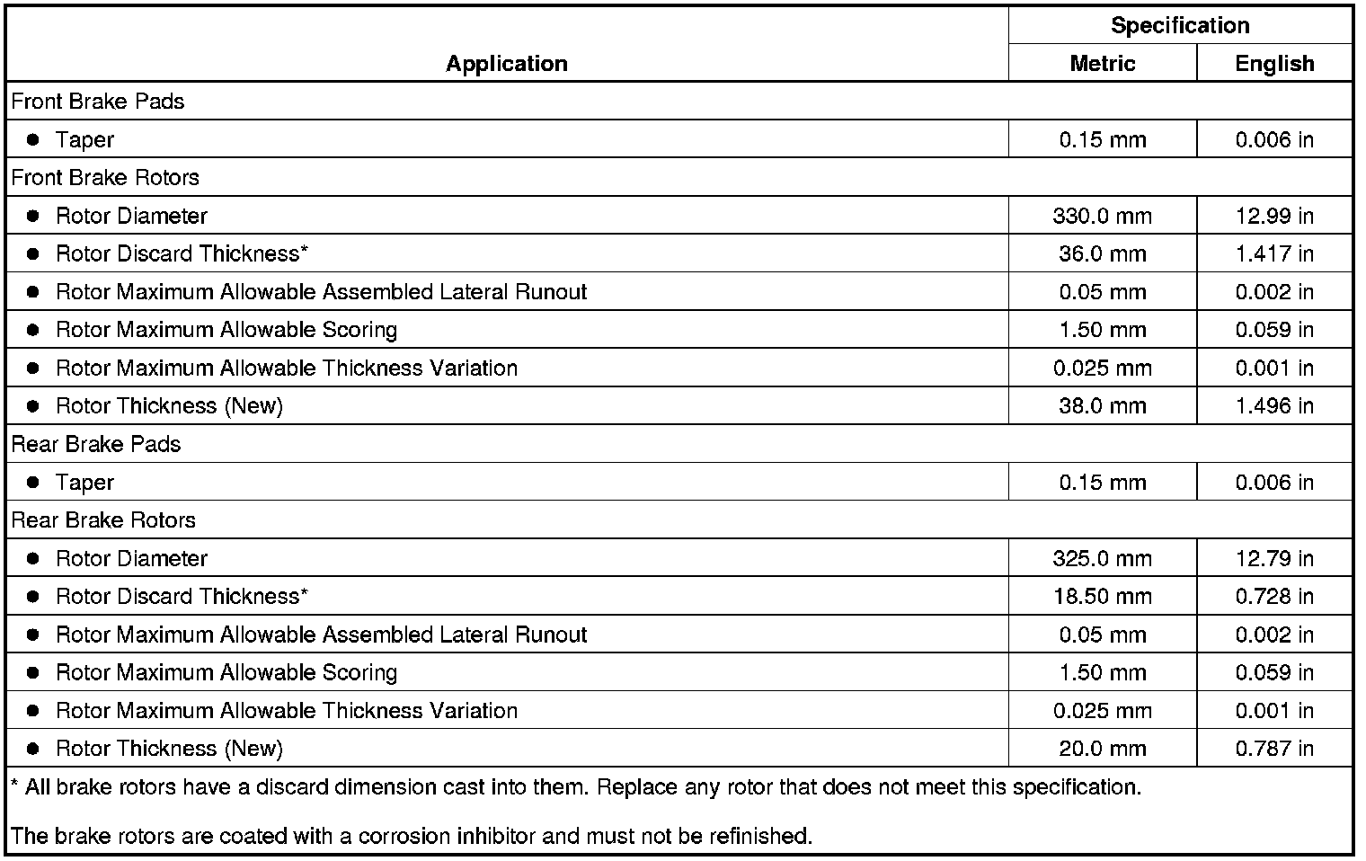 Disc Brake Component Specifications