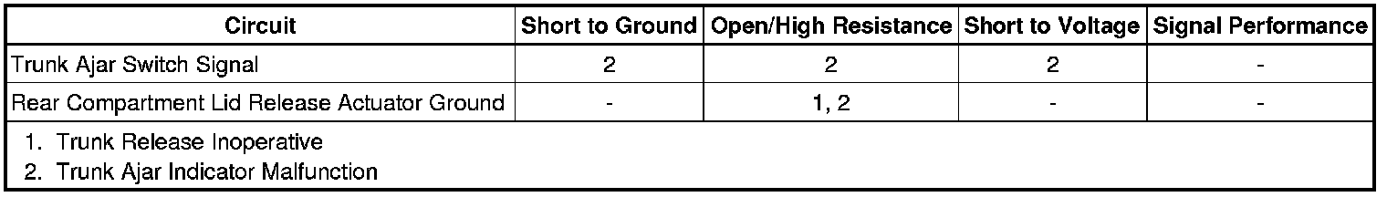 When the rear compartment lid release actuator releases the rear compartment lid, the rear compartment lid ajar switch, which is internal the rear compartment lid release actuator, is supplied with ground which causes the trunk ajar switch signal circuit to be pulled low. The trunk ajar switch signal circuit is an input to the rear integration module (RIM). When the RIM receives a trunk ajar signal, a serial data message is sent to the instrument panel cluster (IPC) requesting the TRUNK OPEN message be displayed on the message center.