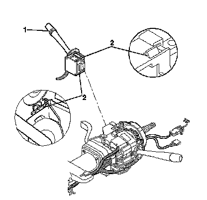 5. Depress the locking tab (2) on the windshield wiper and washer switch (1) and remove the switch from the steering column.