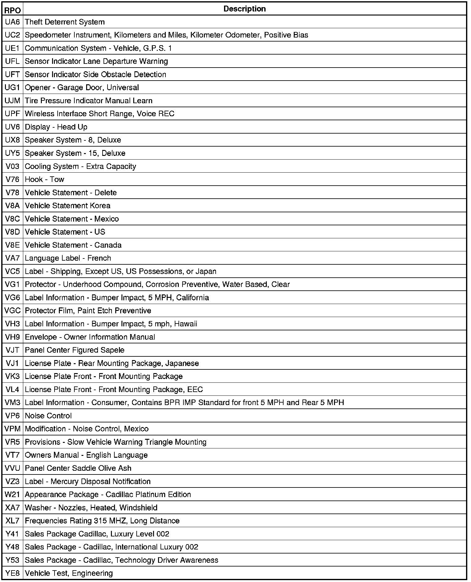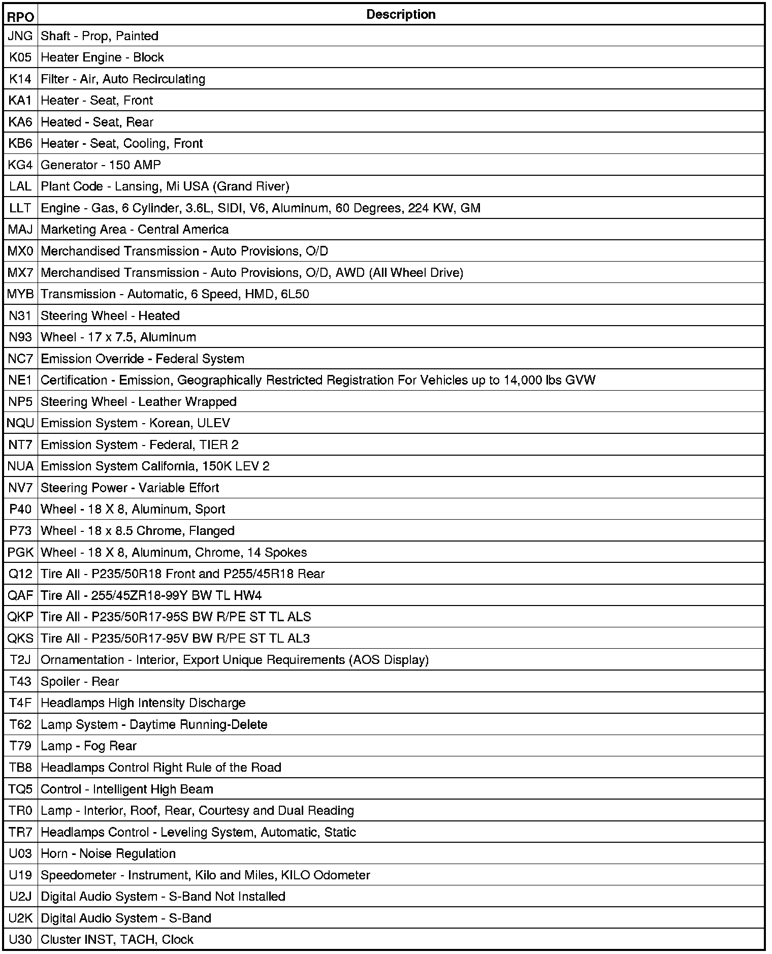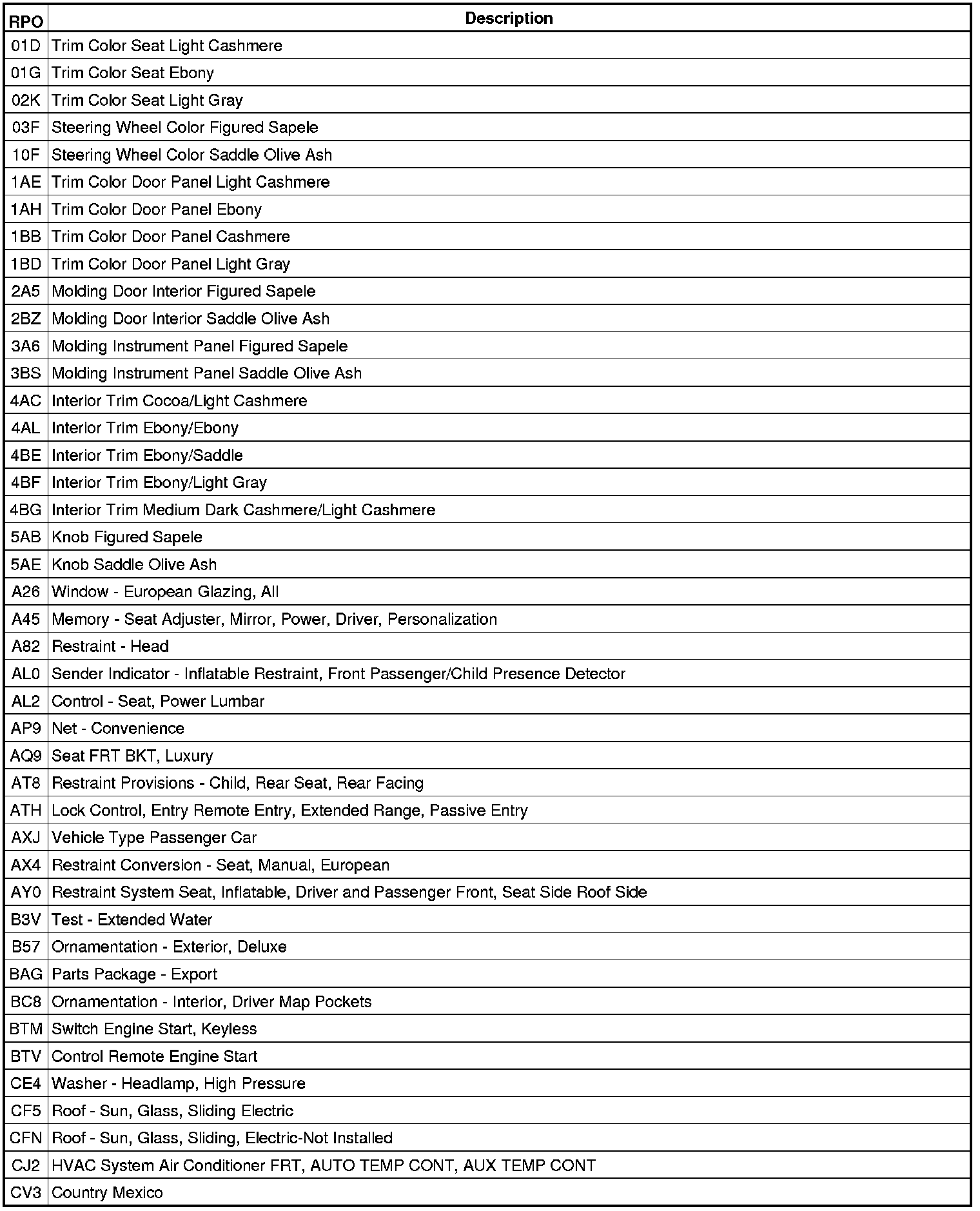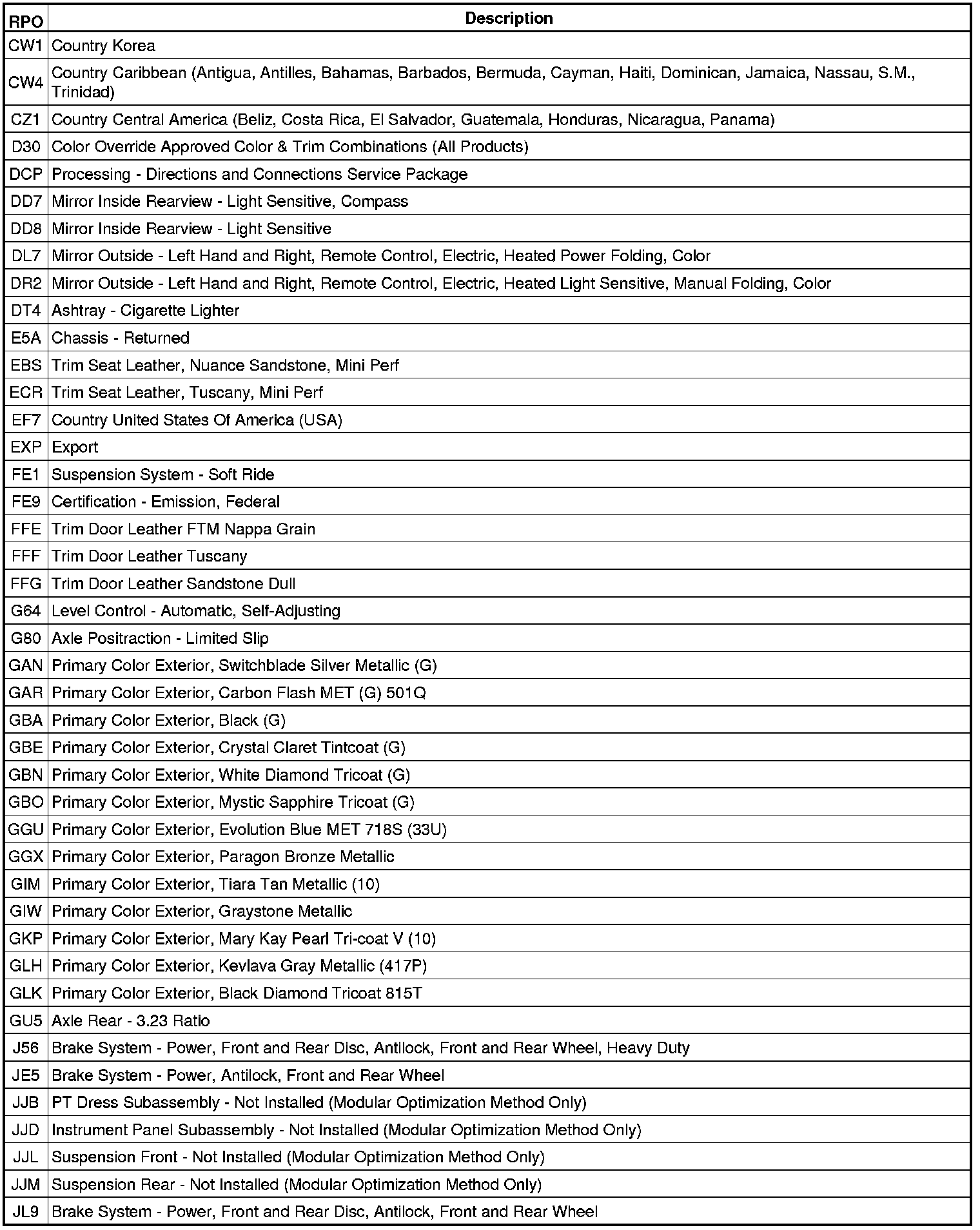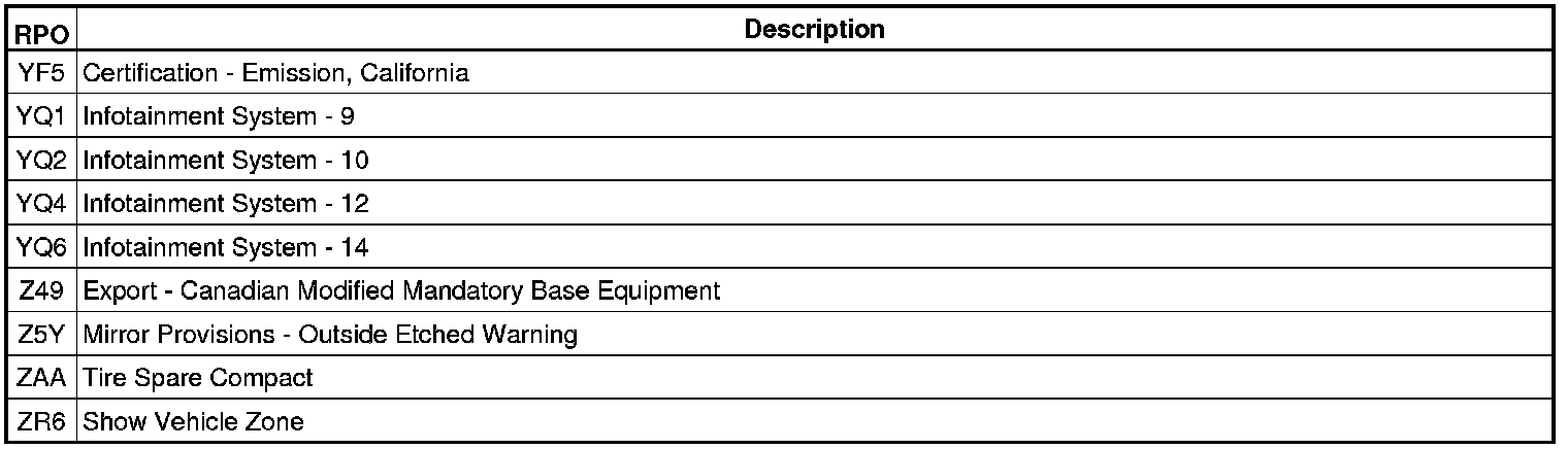 The following table provides the description of the Regular Production Option (RPO) codes that are available on the vehicle. The vehicle's RPO list is printed on the Service Parts Identification Label.
