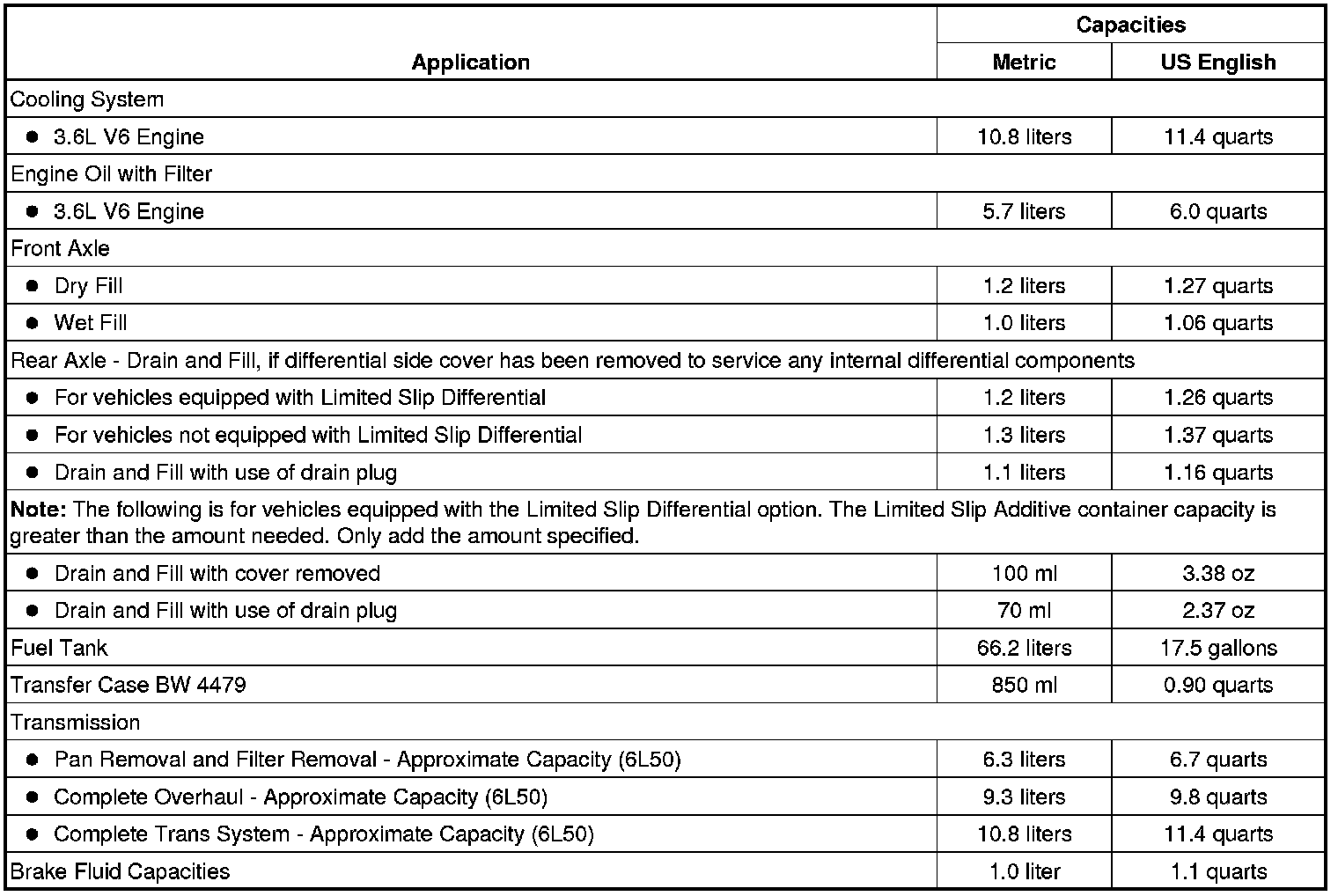 The following approximate capacities are given in US English and metric conversions. See Fluid and Lubricant Recommendations (USA and Canada) (Maintenance) for more information. All capacities are approximate. When adding, be sure to fill to the approximate level, as recommended. Recheck fluid level after filling.