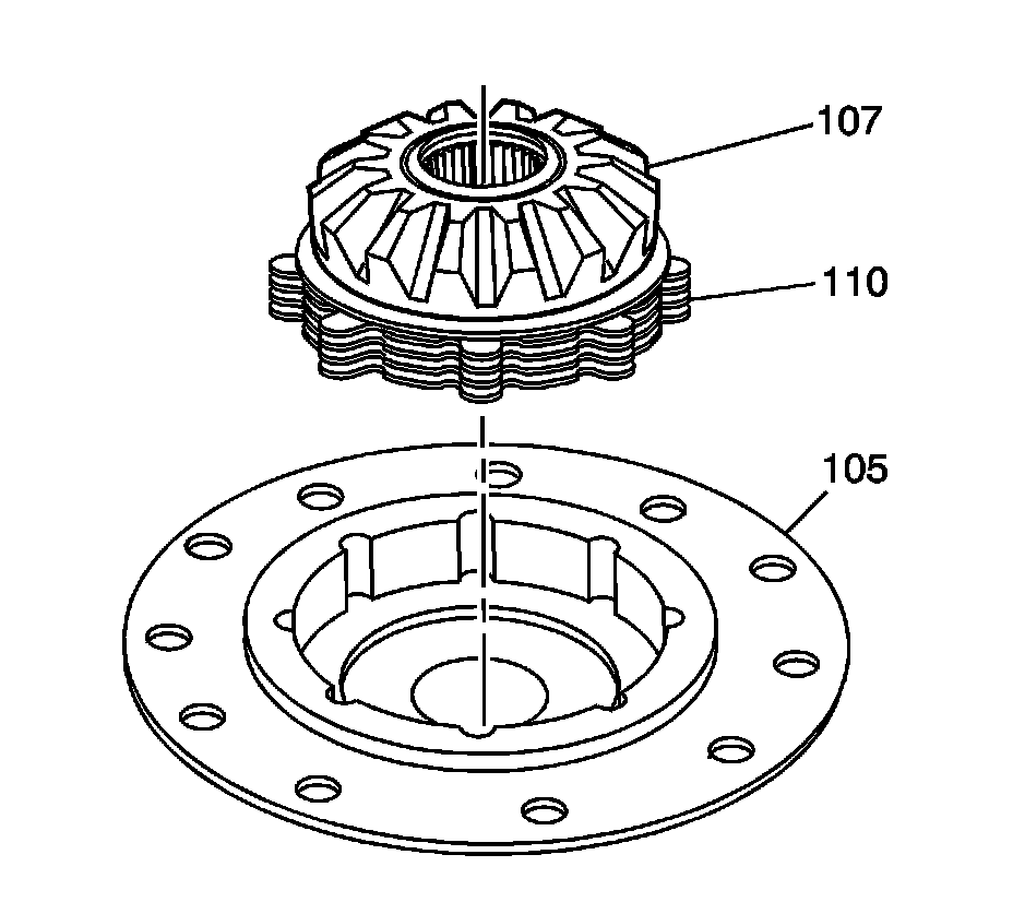 5. Remove the axle side gear (107) and clutch pack (110) from the right half (105).