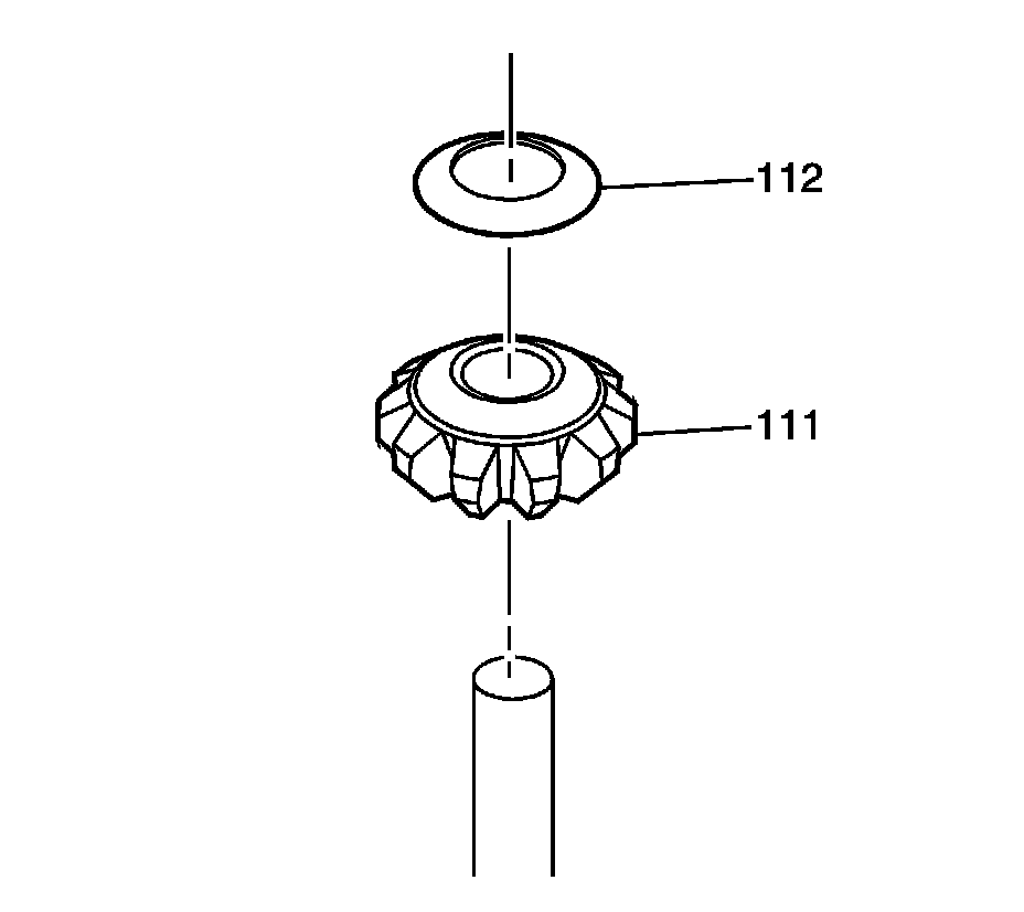 13. Remove the beveled washer from the axle side gear. Note that the orientation of the beveled washer (108) faces out.