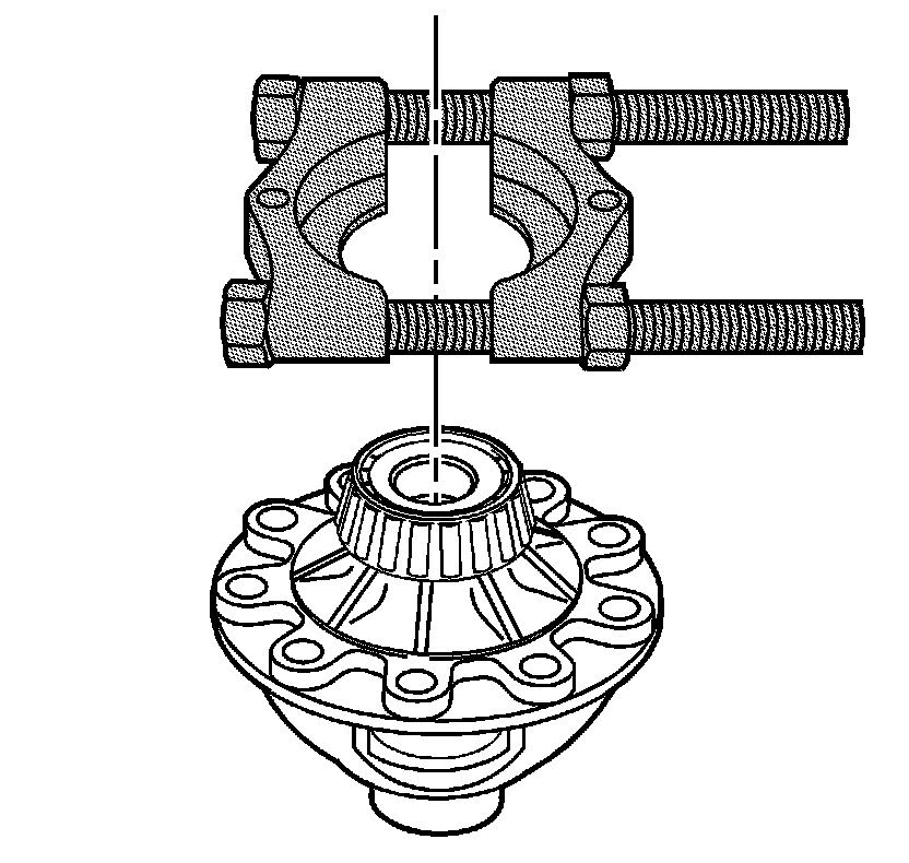 2. Using the J 22912-B and a press, remove the left side bearing. It may be necessary to cut the cage and remove the rollers so the tool will grip the race.