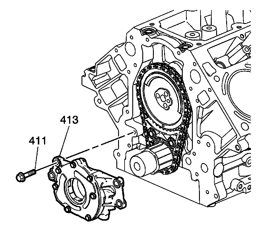 2. Install the oil pump (413) onto the crankshaft sprocket until the pump housing contacts the face of the engine block.