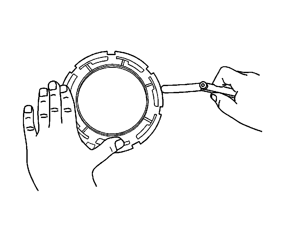 Note: DO NOT use impact tools. Significant force will be required to install the lock ring. The use of a hammer and screwdriver is not recommended. Secure the fuel tank in order to prevent fuel tank rotation.