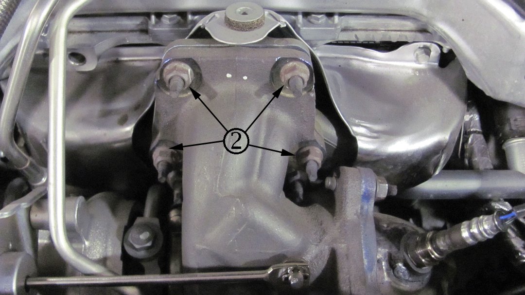 4. Loosen the four turbocharger-to-exhaust manifold nuts (2).