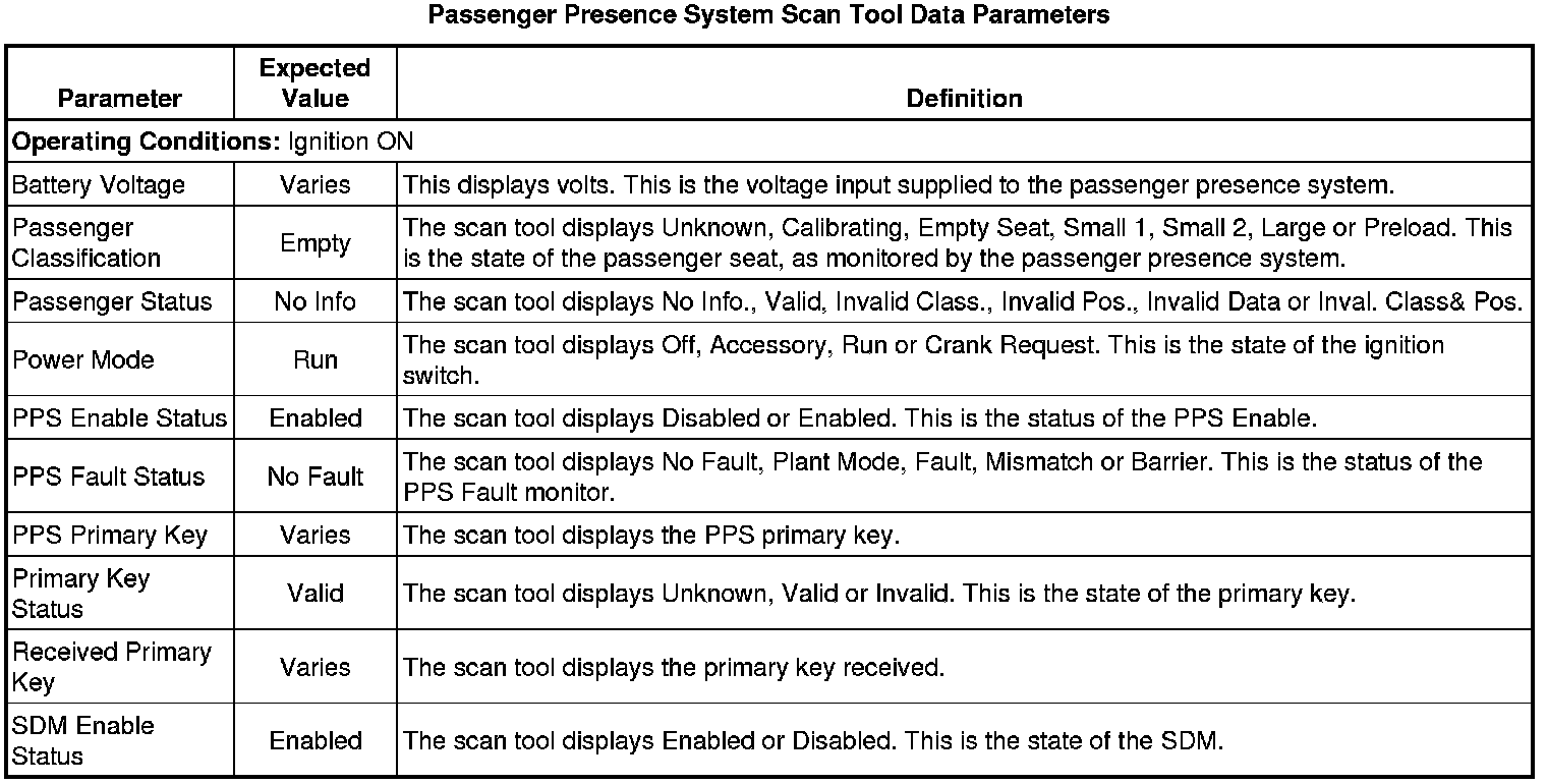 Inflatable Restraint Passenger Presence System Scan Tool Information