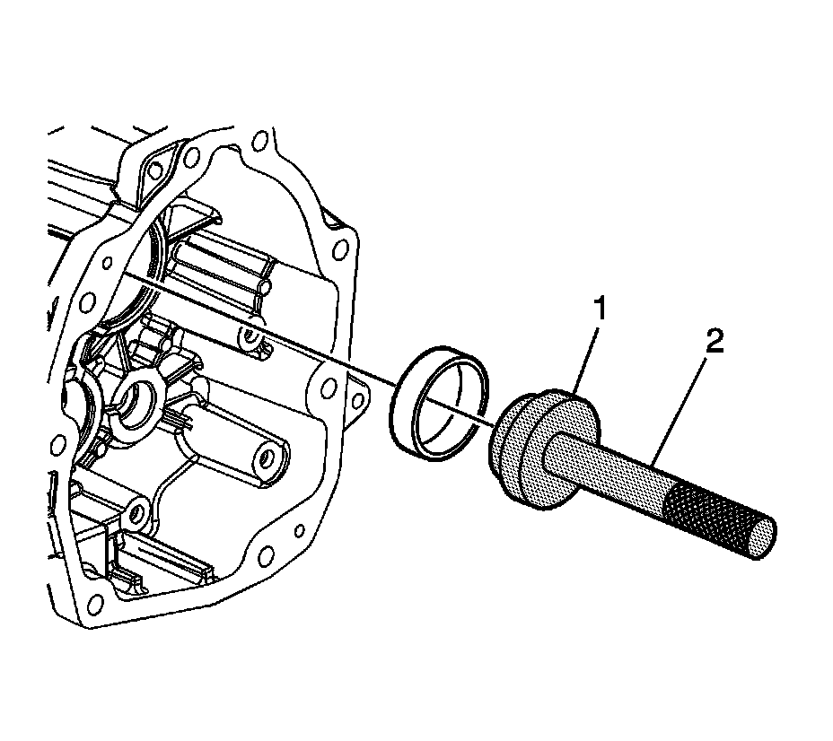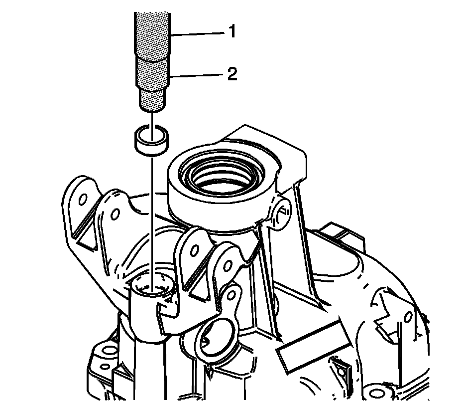 1. Using J 36190 - handle (1) and J 39439-3 - installer (2), install the reverse rail bushing.