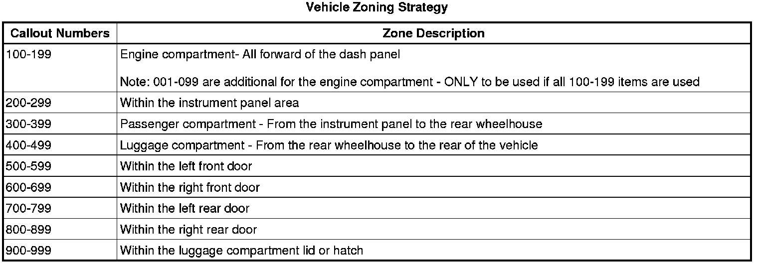 All grounds, in-line connectors, pass-through grommets, and splices have identifying numbers that correspond to where they are located in the vehicle. The following table explains the numbering system.